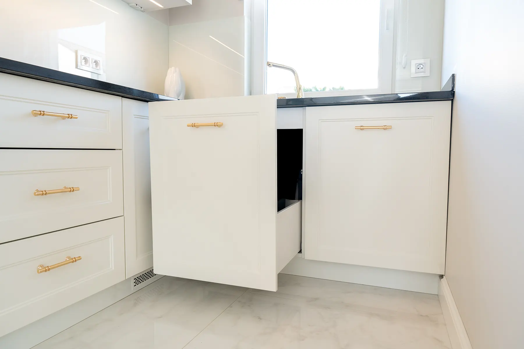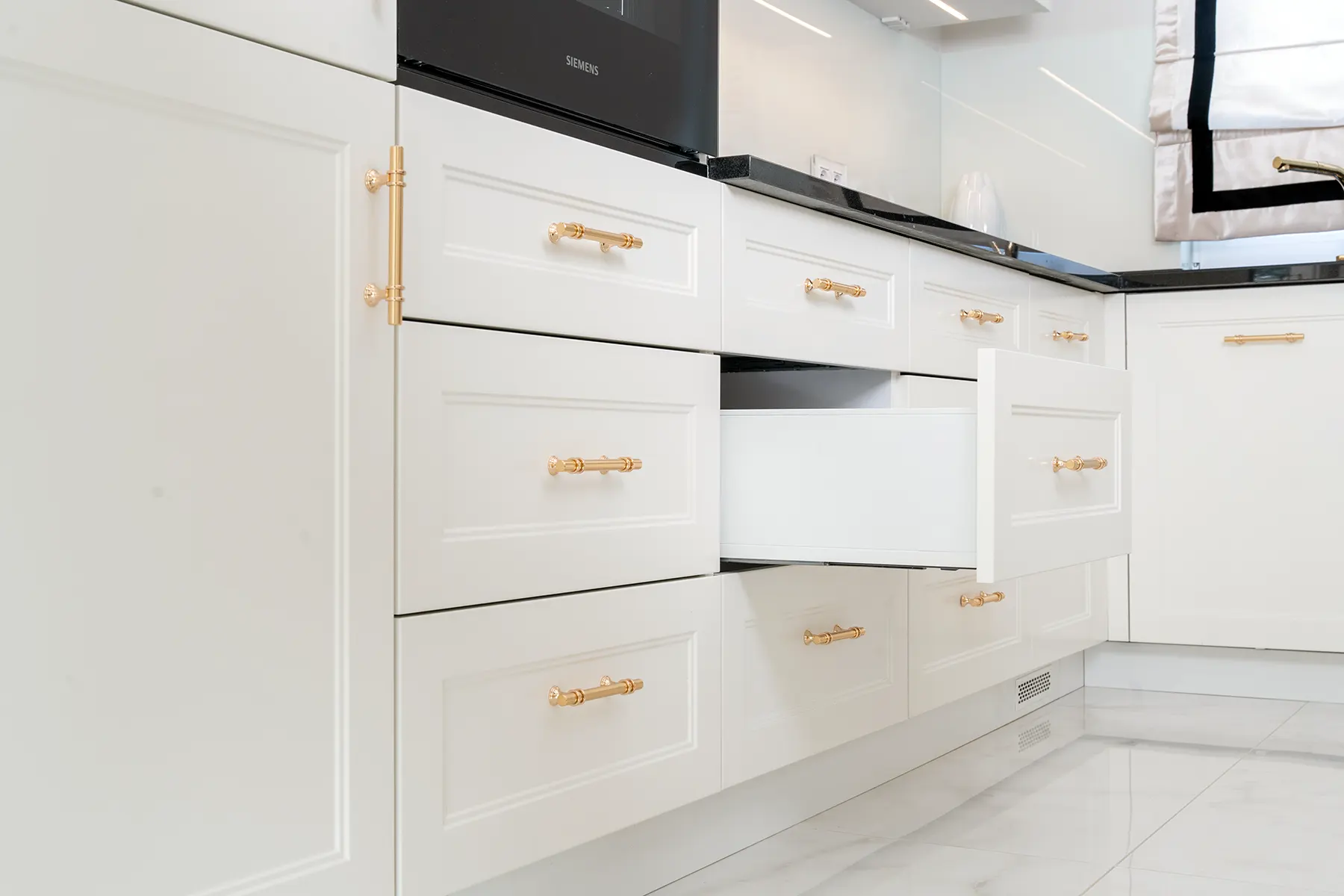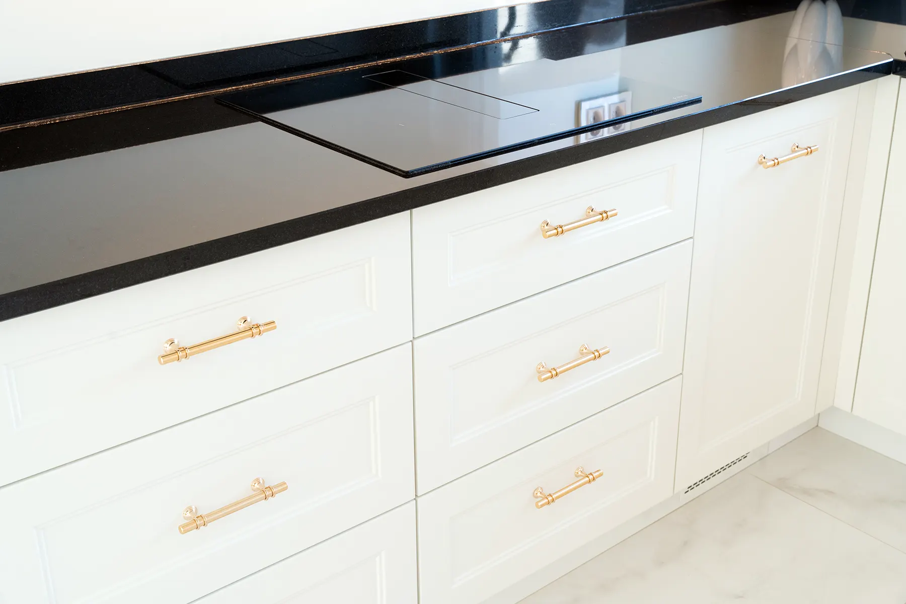 Fronty meblowe wykonane w odcieniu przełamanej bieli dodają wnętrzu lekkości i subtelnego szyku. Stanowią one idealne tło dla głównego punktu kuchni – imponującego blatu z granitu „Galaxy Star”. Jego głęboki czarny kolor z delikatnymi błyskami przywodzi na myśl rozgwieżdżone niebo, dodając wnętrzu głębi i charakteru.