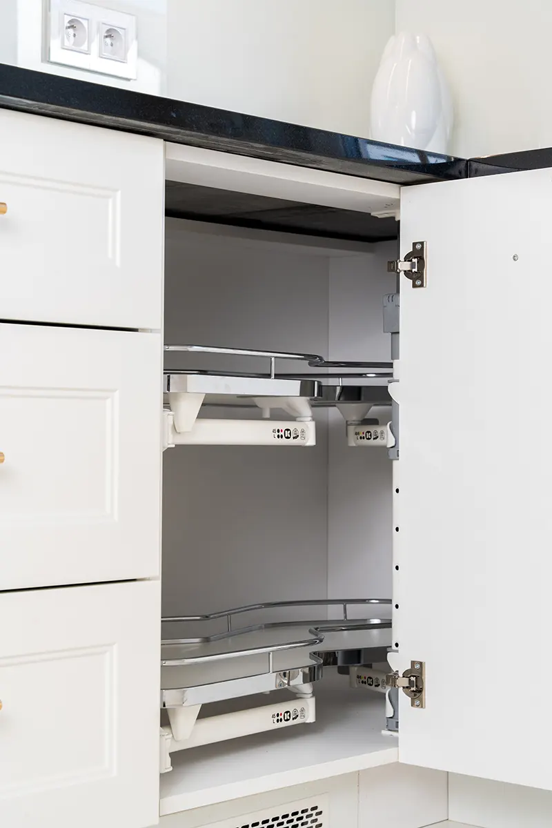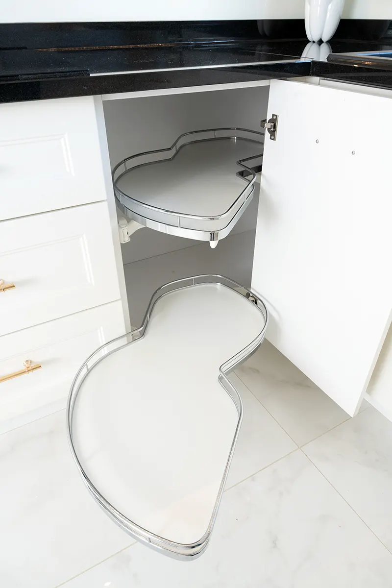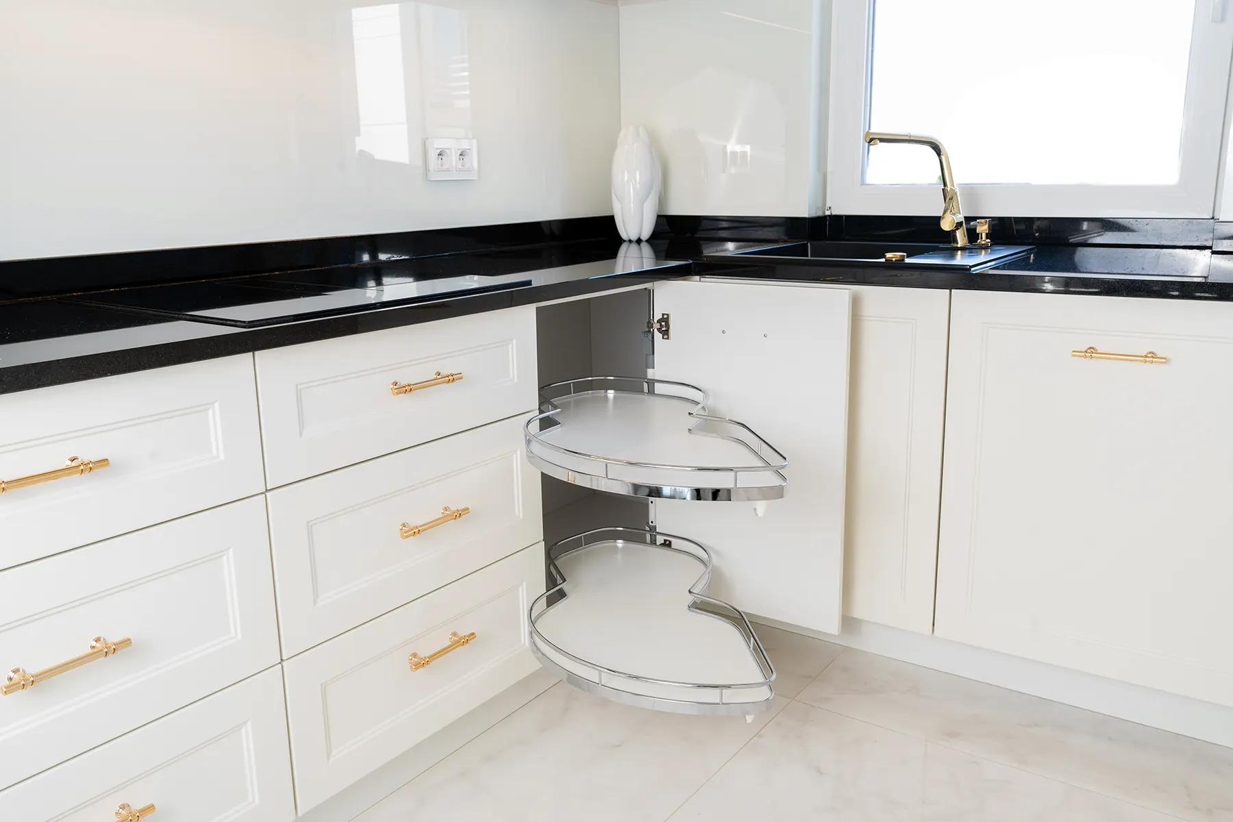 Fronty meblowe wykonane w odcieniu przełamanej bieli dodają wnętrzu lekkości i subtelnego szyku. Stanowią one idealne tło dla głównego punktu kuchni – imponującego blatu z granitu „Galaxy Star”. Jego głęboki czarny kolor z delikatnymi błyskami przywodzi na myśl rozgwieżdżone niebo, dodając wnętrzu głębi i charakteru.