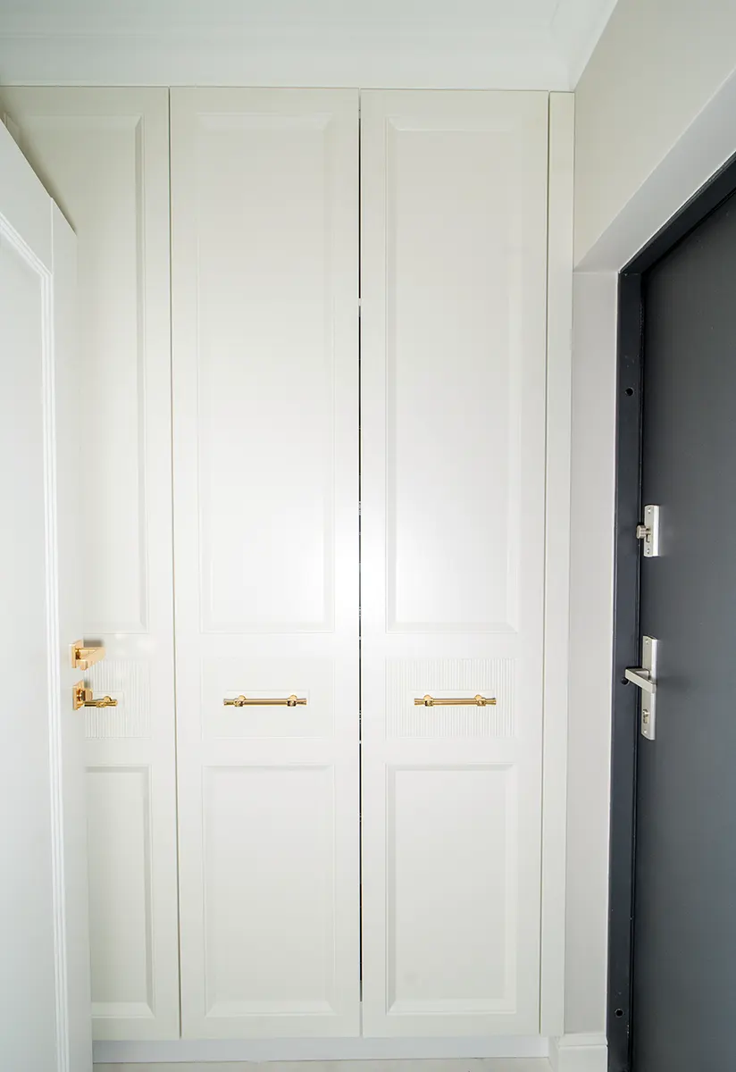 W naszej najnowszej realizacji postawiliśmy na połączenie funkcjonalności z wyrafinowanym stylem. Zabudowa szaf, stworzona według autorskiego projektu, prezentuje się niezwykle elegancko dzięki lakierowanym frontom. Dodatkowym atutem są ręcznie wykonane, mosiężne uchwyty, które dodają całości wyjątkowego charakteru.